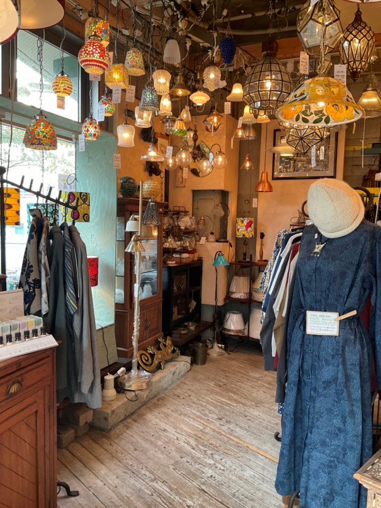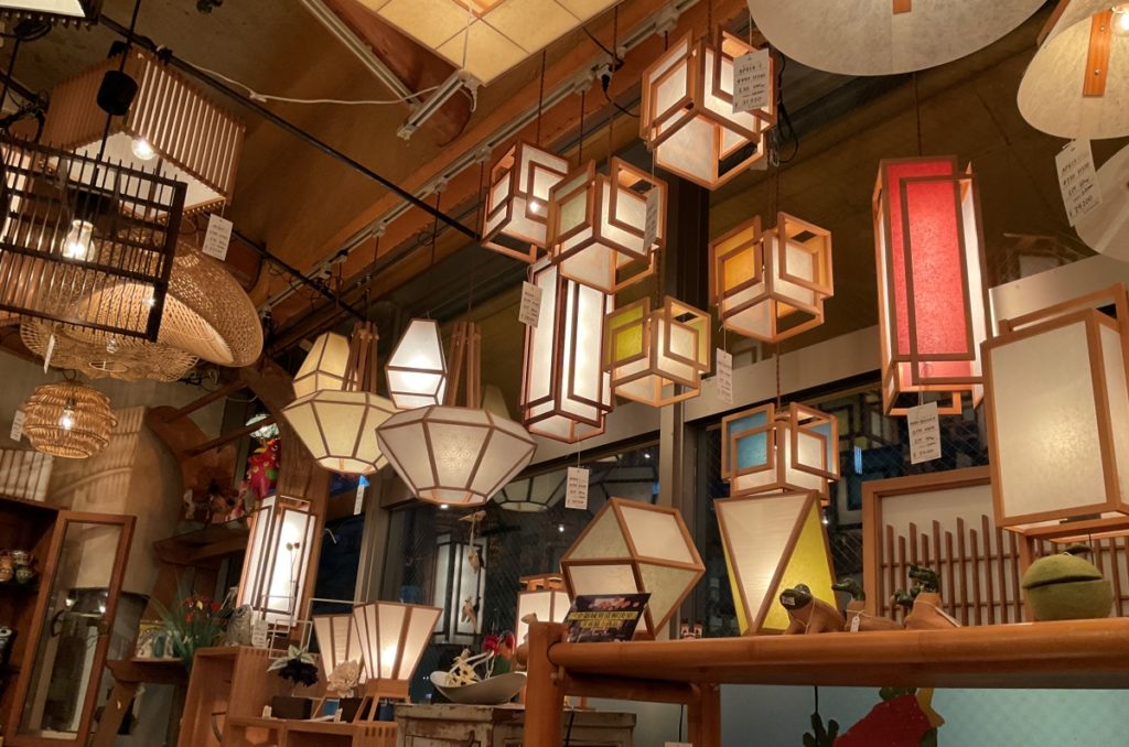 照明は、メーカーとして生産している手作りの和風照明やステンドグラス照明、世界各国の照明や、民芸品やアートオブジェを照明にしてしまったものまで、ユニークな品揃え。