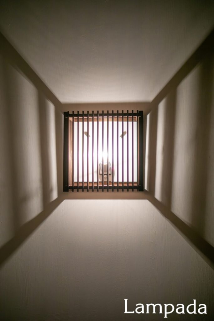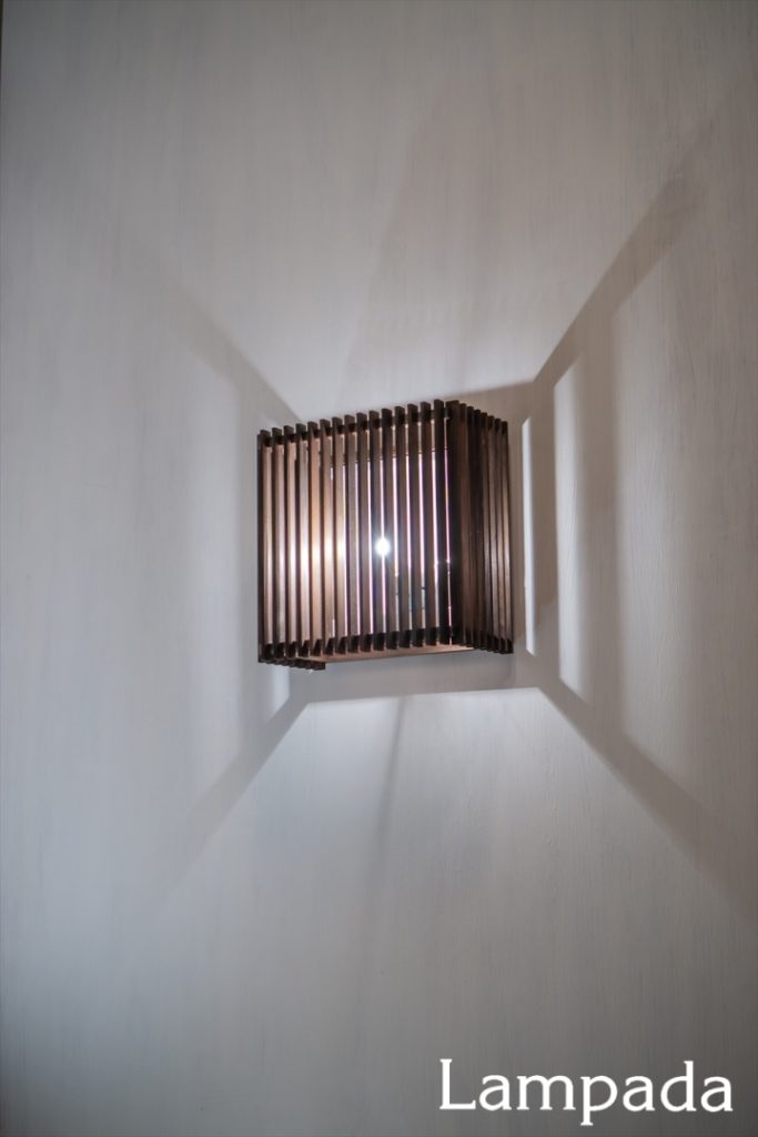組子の合間から抜ける光と、壁に写る影がダイナミックな薄型ブラケット。