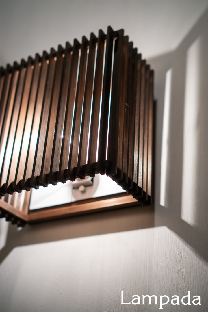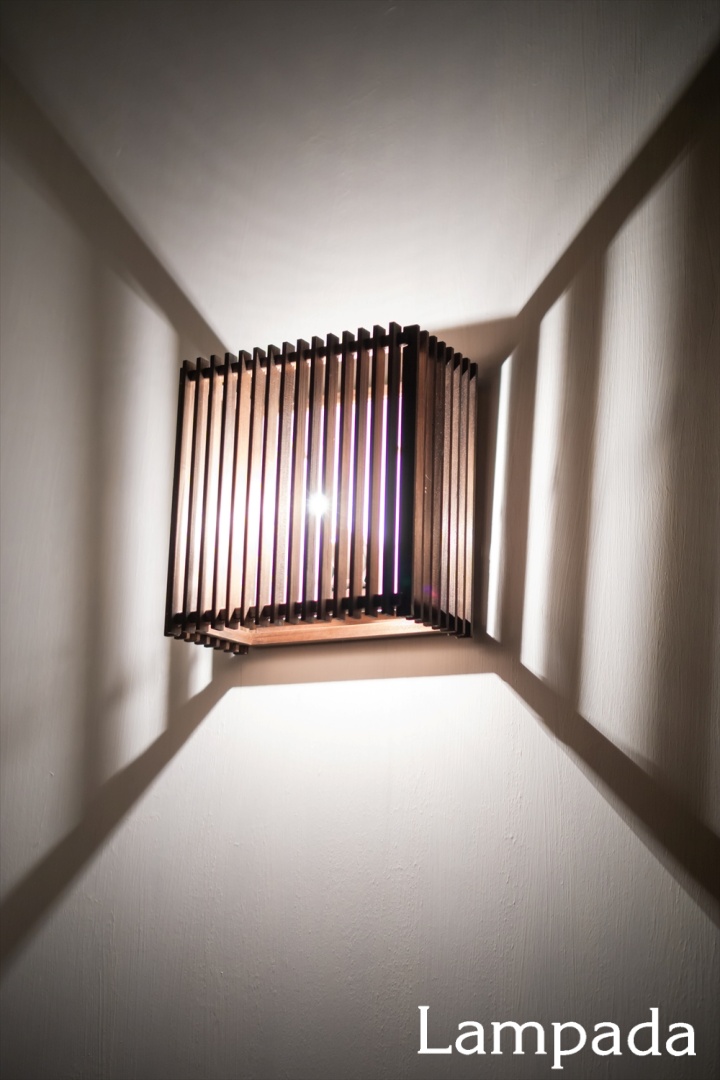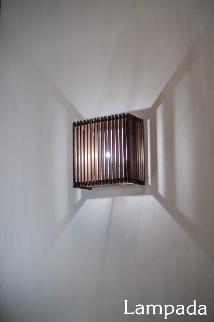 組子の合間から抜ける光と、壁に写る影がダイナミックな薄型ブラケット。
