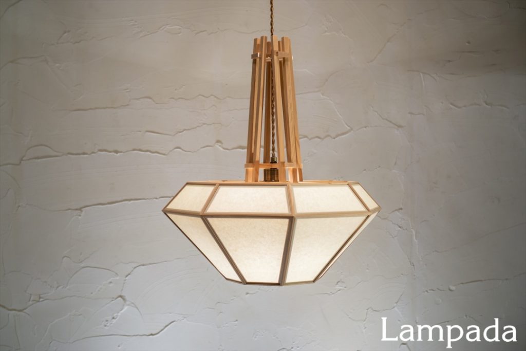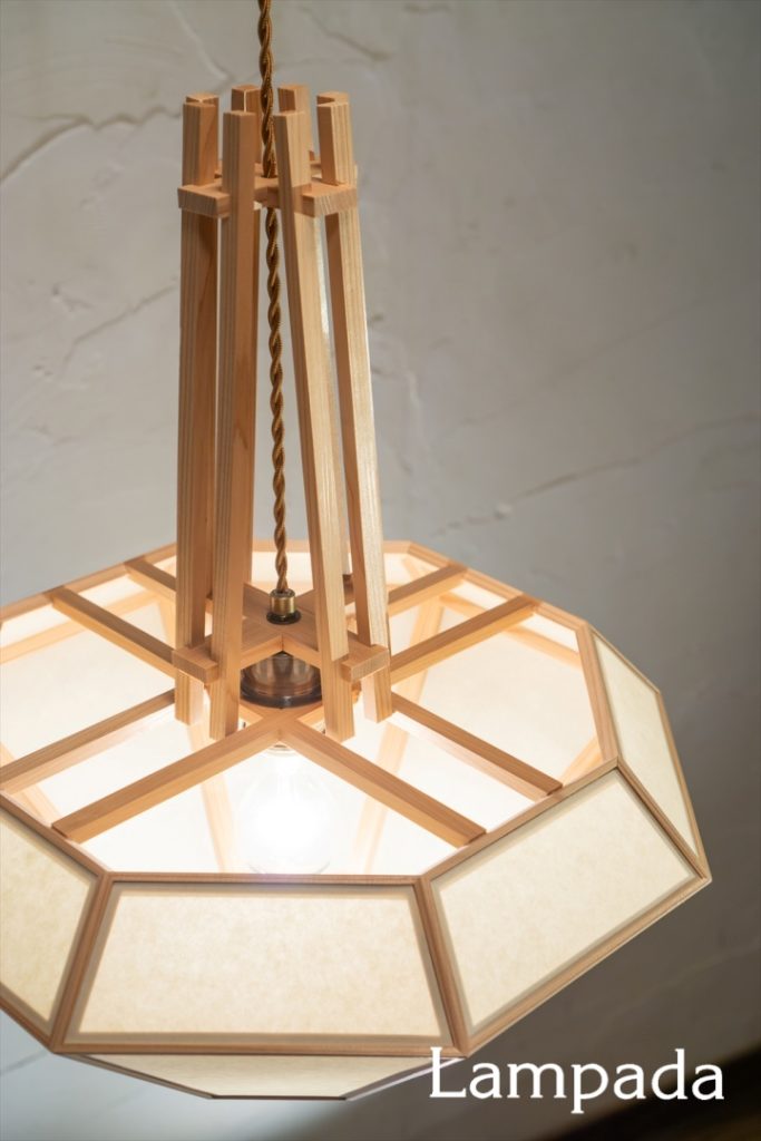 ダイヤモンド型のシェードから立ち上がる国産杉の「木組み」が目を引くペンダント。