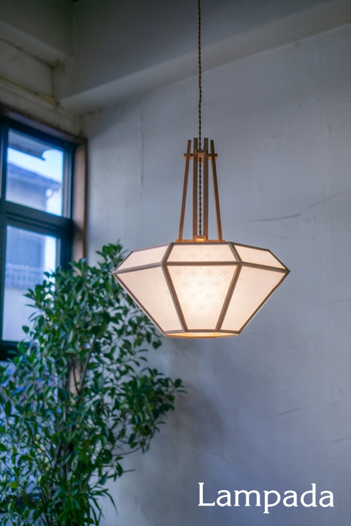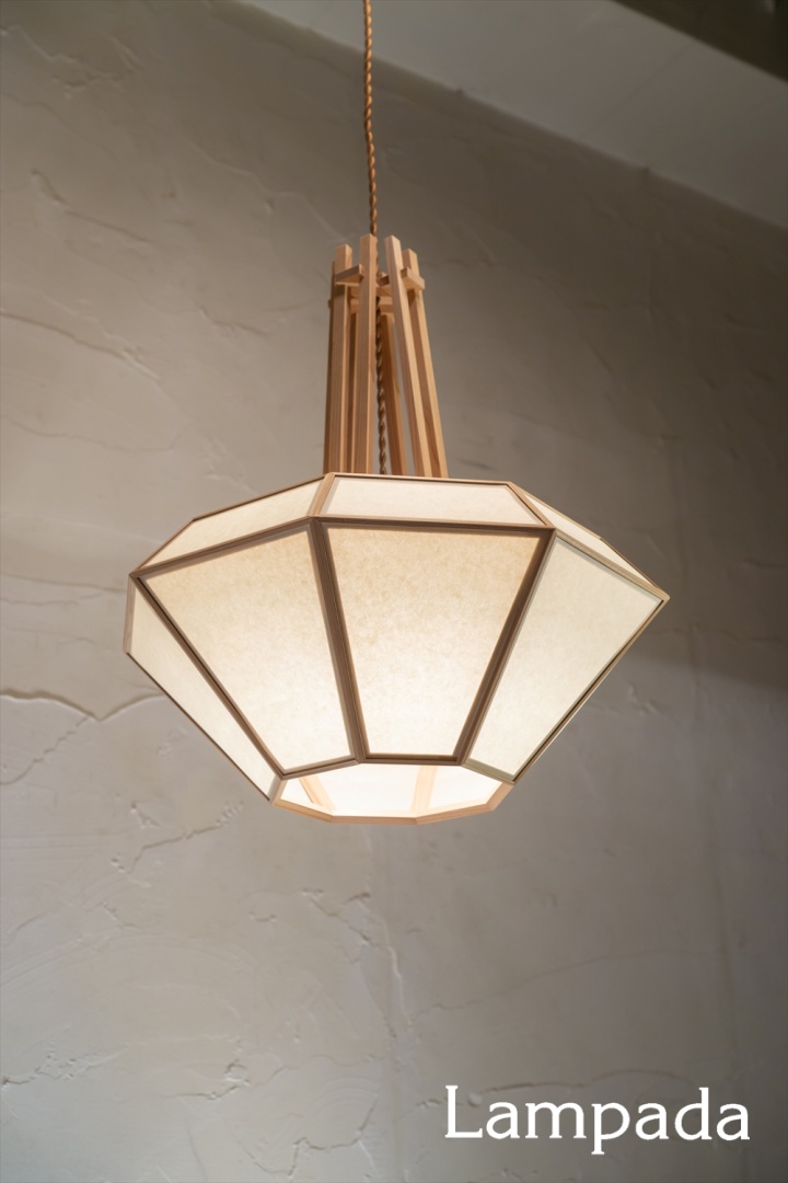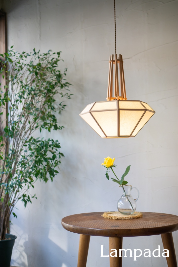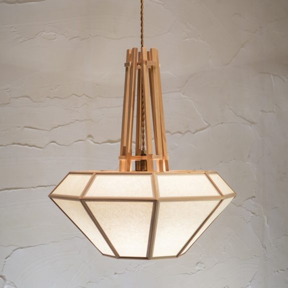 ダイヤモンド型のシェードから立ち上がる国産杉の「木組み」が目を引くペンダント。