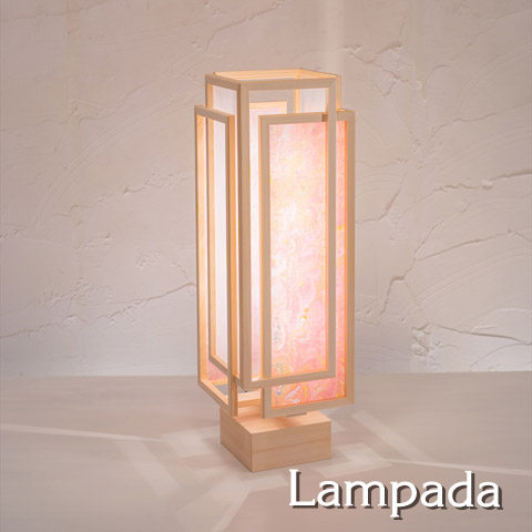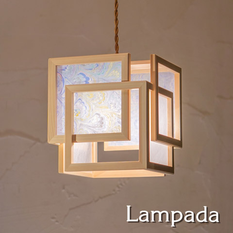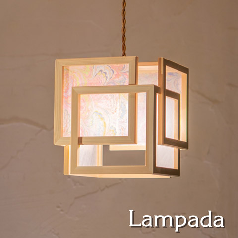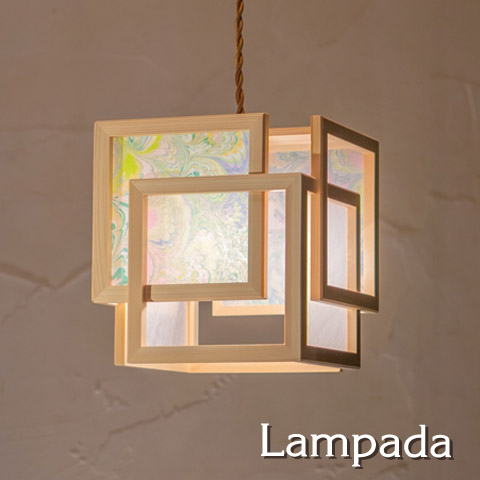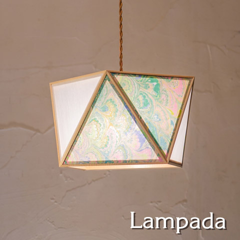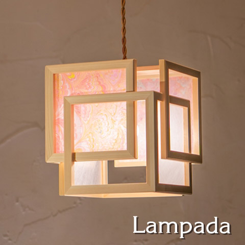 シェード素材として木枠に張ることで、木の柔らかな質感に、美しい色彩が加わった 華やかで上品な灯りになりました。