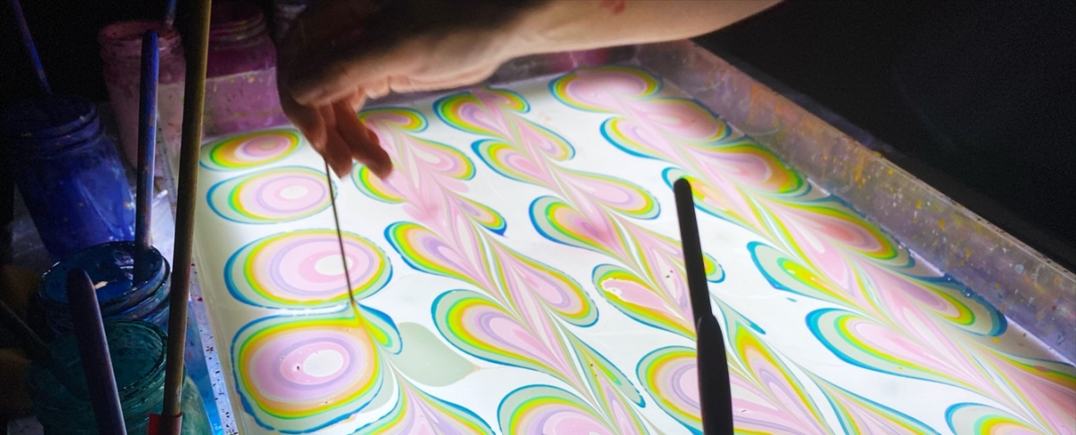 一枚一枚手描きされたマーブリング紙は、豊かな色彩がからまり たゆたう、有機的な美しさが特徴。